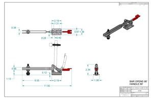 Horizontal Hold Down toggle clamp, Long U-shaped clamping bar, Flanged base. Overall Height 1.95 In, Overall Length 11.00 In, Height Under Arm 1.13 In.